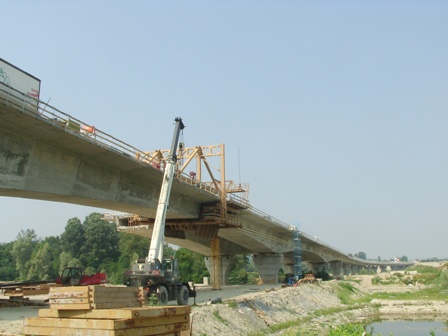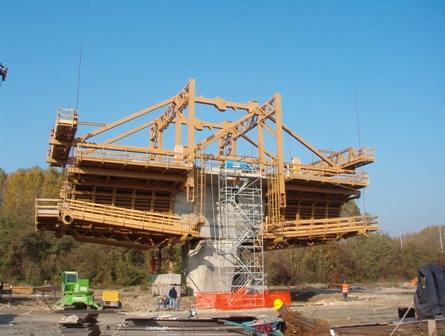 Specifiche: Viadotti costituiti da campate di 100 metri con conci a sbalzo aventi una lunghezza di 8 metri.Fornitura assistenza di due carri, un carrellone per lo spostamento completo dei rombi e dei casseri,delle scatol |